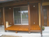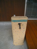 モザイクタイルの埋込(番場の家) 2012年7月18日2014年12月23日 by 福川工務店 番場の家の南側には深い庇があります。居間からはウッドデッキに出られ、土間には地流しがあります。この水栓柱は左官屋さんに下地をおこしてもらい、 外部で使った塗り壁を子供さんを交え、お施主さまにより仕上げられました。モザイクタイルを埋め込んだり、小さな子供さんの手型もあり、思い出になること でしょう。 この庇は、自転車置き場や外用の洗濯機場など、便利に使えそうです。