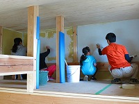 こちらの家は、柱は真壁仕上げとし、壁は左官塗り壁で計画をしていました。工事が進みだすとお見積り以上のご希望も増えてきて、お施主さまからも「減らせ そうなところはありますか」とのご相談により、2階の壁を左官塗り壁から和紙クロスに変更することにしました。和紙クロスの柄も選んでいただいている時期 にもかかわらず、お施主さまに「自分で壁を塗られてはどうですか?」と話した(口をすべらせた)ところ「やります」との返事。連休中のご家族に合わせ、小 林左官さんに「塗り壁教室」をしていただきました。まずはあまり目立たないロフトにて、下地処理のパテ・マスキングテープなどの養生から材料煉り、そして 壁塗りと一連の作業を教わり、みなさんで実際に塗ってもらいました。お引き渡しの後の壁塗り作業になりますが、2階にはロフトや吹き抜けもあるのですこし 時間がかかりそうです。