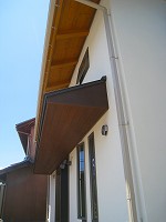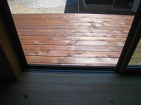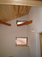 NG邸では、夏に琵琶湖から吹いてくる風が家中に抜けるように、窓の位置と間取りを考えました。吹き抜けの上部にある高窓から、熱気を逃がしてくれます。居間の掃出し窓についている大きめの庇は、夏の日差しを室内に入れないよう遮ってくれます。影の写真は7月の完成見学会の正午です。