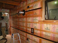 防湿フィルムを室内側に貼り、コンセント廻りなどの処理も行い、室内で発生した湿気を壁のの内部に侵入させないようにしています。(ベーパーバリア)