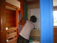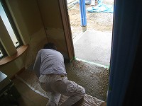 大工事が終え大工が抜けると、いよいよ仕上げ工事にかかります。左官屋さんが玄関土間の洗い出しをし、タイルやさんが洗面のタイルを貼、クロスやさんが壁の和紙クロス貼をとお互いかち合わないよう段取りよくすすめてもらっています。