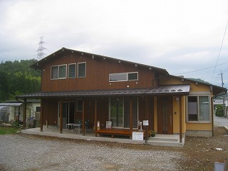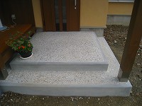 外観(番場の家) 2012年7月16日2014年12月18日 by 福川工務店 大屋根は、ガルバリウム鋼板の立平葺きです。 外壁の大部分は着色した杉板貼ですが、玄関から道路沿いは、左官塗り壁で仕上げています。。 玄関とポーチの土間は、左官屋さんによる洗い出しで仕上げています。一般的なタイル貼には無い手作業の味が出ました。