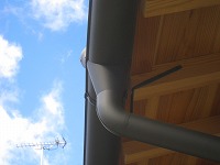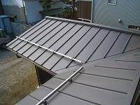 板金工事(本町の家) 2012年11月10日2014年12月18日 by 福川工務店 今回は、いつもの塩ビ製の樋でなく、ガルバリウムでできた金属製の樋を架けました。質感が、木の家とよく合います。落ち口の形もすっきりしてきれいです。ただし、一度凹むと戻らないので注意です。屋根も板金工事で、ガルバリウムの立平葺きです。