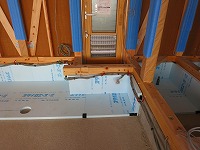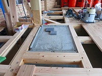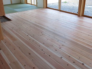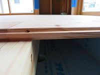 高宮の家では、床に杉のフローリングを貼りました。杉は、柔らかいので足触りがよく、スリッパなしの素足で暮らせます。反面、傷つきやすいとも言えますが。1階は、大引の間隔を狭くして、厚さ30mm・巾180mm・長さ4mの板を貼っていきます。基礎の立ち上がりと外周部には、スタイロフォームを貼り基礎断熱としていますので、冬でも冷たくありません。薪ストーブの土間は、下からブロックを立ち上げ下地をつくっています。