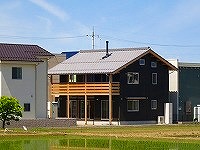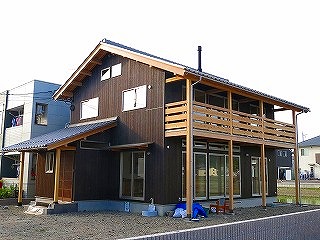 いぶしの日本瓦に全面黒い焼板の外観です。周りは最近の家ばかりの住宅地に建っていますが、そう違和感は感じないように思います。破風板・垂木・裏板やバルコニーなどの木部は、あえて着色せず、無色の保護塗料をお施主様が塗られました。木がやけて黄色くなっていくのは、着色した場合より早くわかるでしょうが、塗装が落ちるあの感じにはならず、経年変化でよい味になってくることを願います。